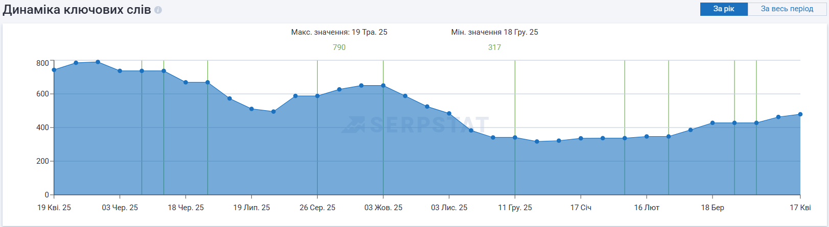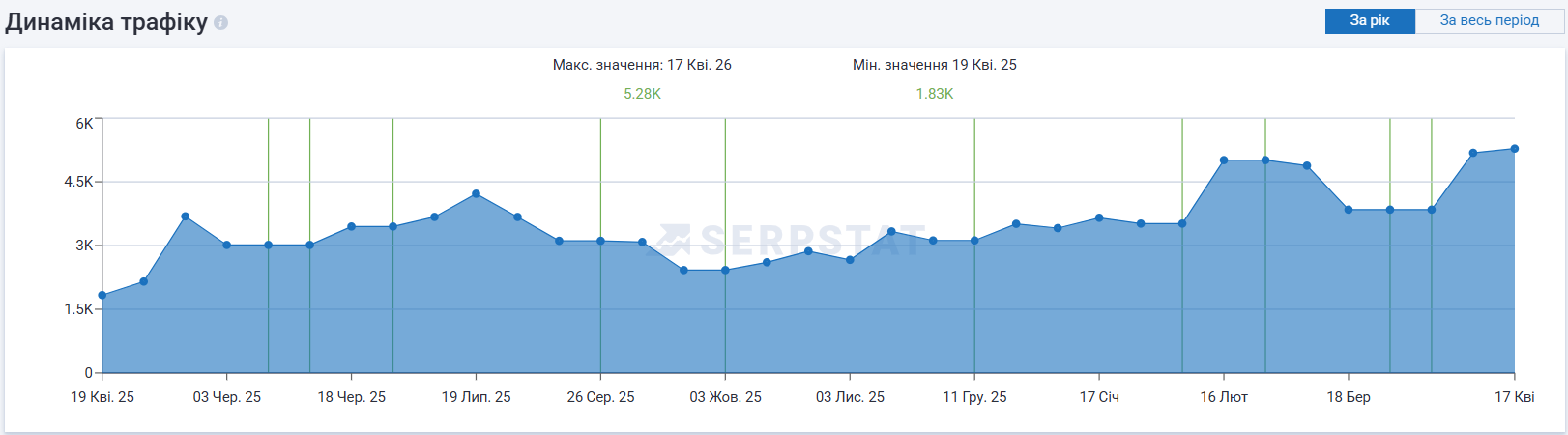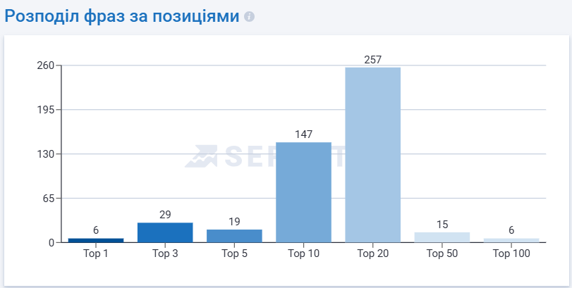 За год работы нам удалось увеличить объем органического трафика почти втрое. Особенно успешным стал период с февраля по апрель 2026 года, когда трафик продемонстрировал стремительный рост, достигнув отметки в 5280 посещений. Распределение фраз по позициям подтверждает эффективность стратегии: 147 ключей вошли в ТОП-10.