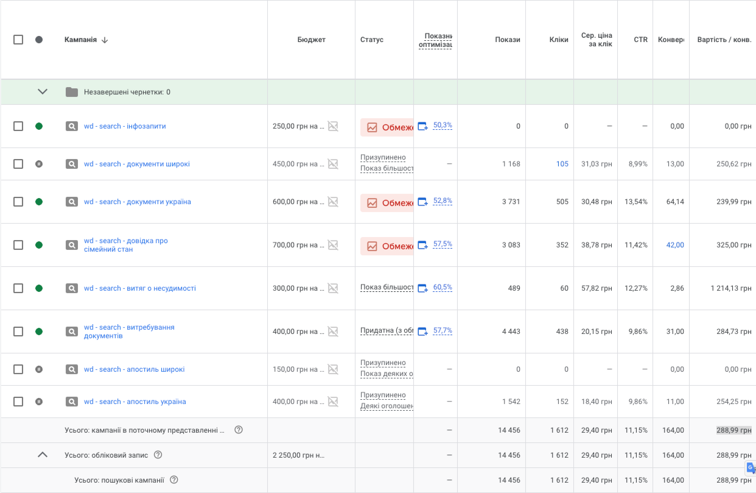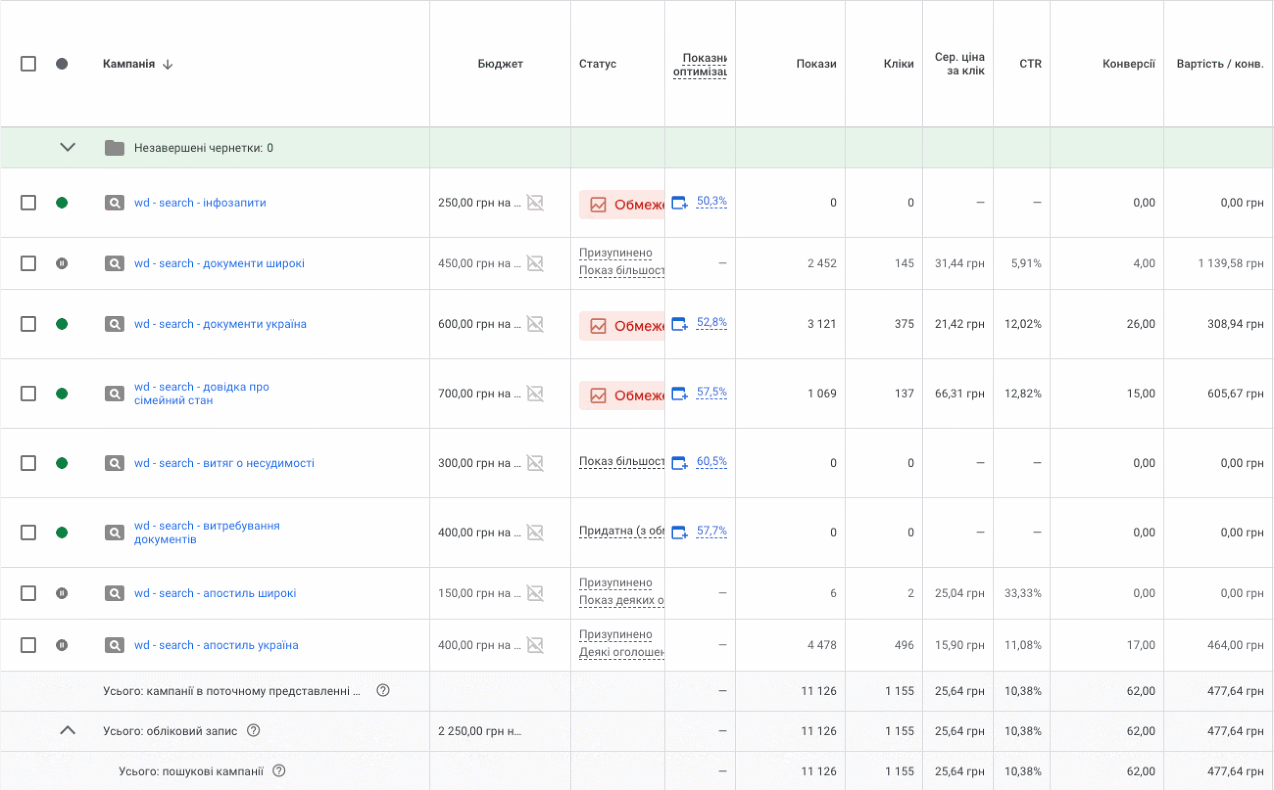Клиент самостоятельно запускал рекламу, однако столкнулся с рядом критических проблем: учетная запись Google Ads была заблокирована из-за нарушения политики платформы, а предыдущие поисковые кампании, запущенные на промежуточные сайты-«прокладки», работали без конверсий и не давали измеримого результата. Бизнес-цели клиента – получение новых заказов, построение стабильного потока лидов с оптимальной стоимостью, а также развитие спроса из Европы, где его находит украинская аудитория.